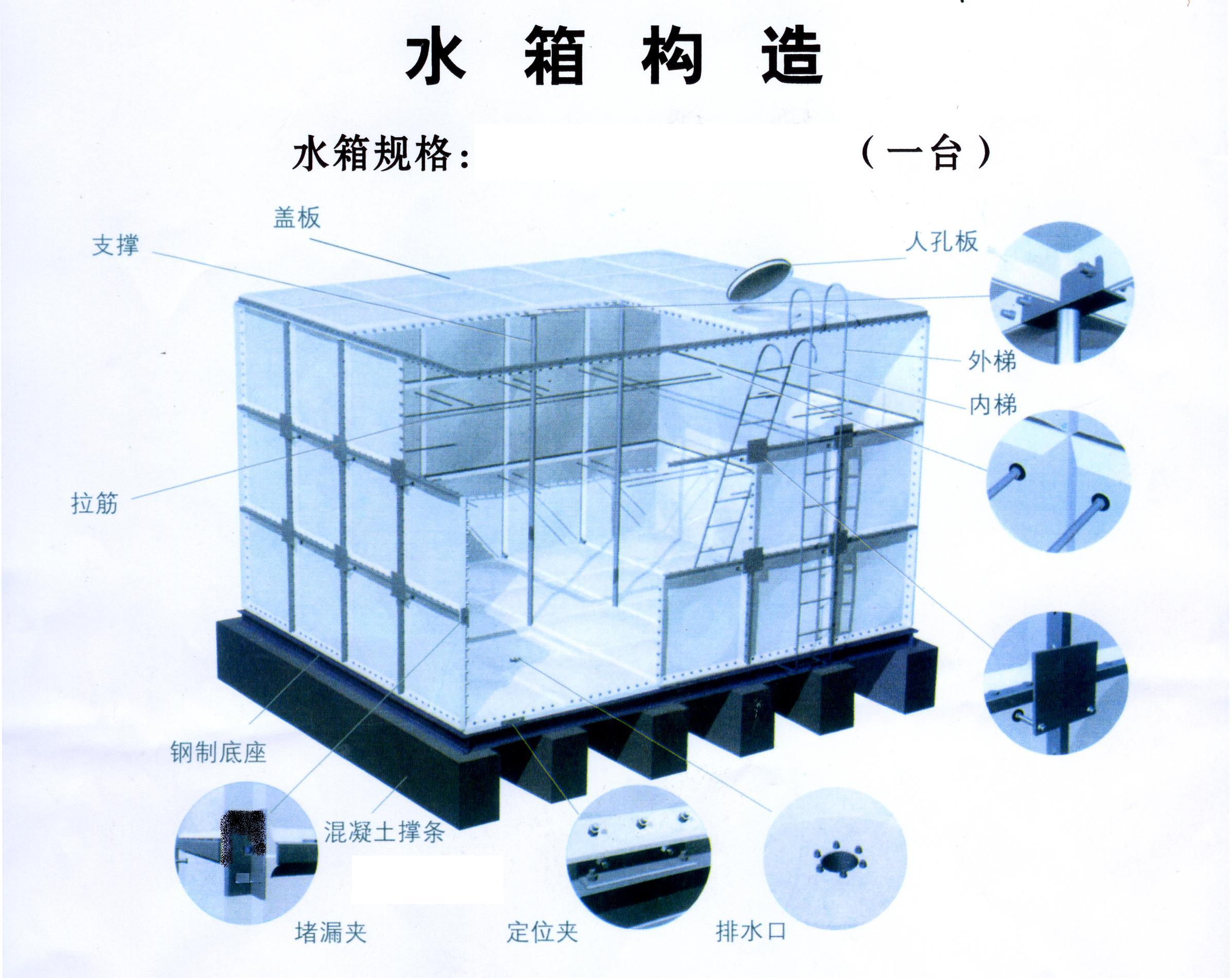 水箱是工礦企業(yè)、民用住宅等公共供水系統(tǒng)不可缺少的組成部分。目前我國主要采用混凝土和鋼板水箱,但混凝土水箱的滲漏、結(jié)垢,鋼板水箱的銹蝕,對水箱的使用造成很大影響,據(jù)北京市環(huán)保局現(xiàn)場檢測,由于水箱的菌藻、銹蝕污染而無法達(dá)到供水水質(zhì)標(biāo)準(zhǔn)。自八十年代,普遍采用組裝式玻璃鋼水箱,解決了上述問題,玻璃鋼(FRP)水箱具有無泄漏、無變形、無污染、使用壽命長等優(yōu)點(diǎn),并且組裝容易、外形美觀,可根據(jù)用戶需要組裝成不同噸位的水箱,SMC組合式水箱是目前國際上采用的新型水箱。由整體優(yōu)質(zhì)的SMC水箱板拼裝而成。其特點(diǎn)是采用食品級樹脂,因此水質(zhì)好,清潔無污染;具有強(qiáng)度高,重量輕,耐腐蝕,外型美觀,使用壽命長,保養(yǎng)管理方便等特點(diǎn)。我公司生產(chǎn)的SMC組合式玻璃箱水箱是國家建筑材料工業(yè)局和建設(shè)部件******批推薦的產(chǎn)品,完全符合國家建筑工業(yè)局標(biāo)準(zhǔn)JC658.1-1997的技術(shù)性能要求。該水箱經(jīng)國家有關(guān)部門檢測,水箱符合要求,廣泛適用于工礦,企事業(yè)單位、住宅、賓館、飯店等建筑,作為生活飲用水、中水處理、消防用水及其他用水儲(chǔ)水設(shè)施。SMC模壓單板是采用食品級樹脂生產(chǎn)的SMC片材,經(jīng)高溫、高壓、機(jī)械壓制而成。在制造 工藝上,采取機(jī)壓成型的制作方法。增加了抗震、抗沖擊的強(qiáng)度、克服了手糊制品強(qiáng)度不均勻的缺陷,提高了耐壓強(qiáng)度和使用壽命;在外型設(shè)計(jì)上,板塊中部呈凹陷弧度,提高了水箱的承壓能力,同時(shí)板塊四周沒有45度和90度的凸緣,組裝時(shí)不用邊角連接件,更具有柔韌性和靈活性.SMC組合式玻璃箱水箱是由SMC模壓板塊、密封材料、金屬結(jié)構(gòu)件及配管系統(tǒng)現(xiàn)場組裝而成。給設(shè)計(jì)和施工帶來極大方便。一般水箱按標(biāo)準(zhǔn)設(shè)計(jì),特殊水箱需要專門設(shè)計(jì)。可根據(jù)用戶需要組裝0.125 ~1500立方米的水箱。若原有水箱需要更換,不需要改造房屋,適應(yīng)性很強(qiáng)。專門研制的定型產(chǎn)品密封帶,該密封帶******、耐水、彈性大、******變型小,緊固密封。水箱整體強(qiáng)度高,無滲漏,無變行,保養(yǎng),檢修方便,鋼支架規(guī)格尺寸要與箱板單元板塊之間連接縫配合,丁字鋼相應(yīng)變化,角鋼與混凝土條基之間加支撐點(diǎn)。