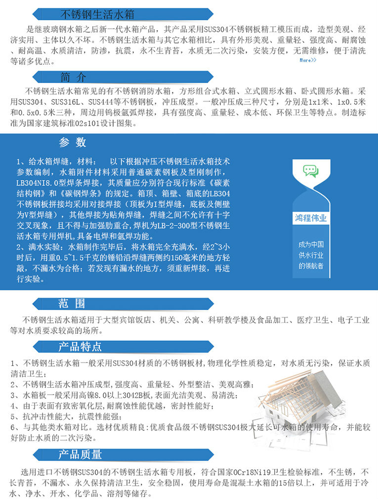 1、不銹鋼水箱一般采用SUS304材質的不銹鋼板材,物理化學性質穩定,對水質無污染,保證水質清潔衛生;