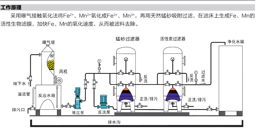 除鐵錳過濾罐是通過均質等粒徑錳砂形成砂床,作為過濾載體從而進行立體深層過濾。其過濾精度視砂粒大小而定。過濾時:水從罐體上部的進水口流入,通過砂石介質層孔隙向下運行滲透,雜質被隔離在砂石介質層上部。過濾后的凈水經過過濾器底部的過濾元件進入出水口流出,即完成水的過濾過程。如果處理水量較大,應多臺并聯使用??蛇^濾綠藻、漂浮物等。。